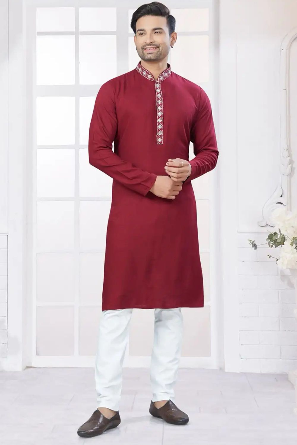 - Features a mandarin collar with embroidered detailing around the neckline and button placket and full sleeve kurta.