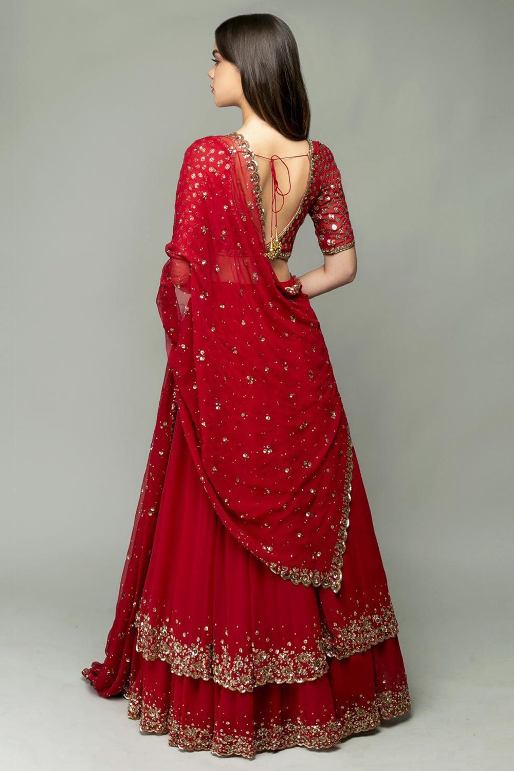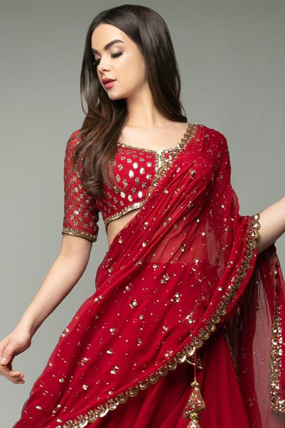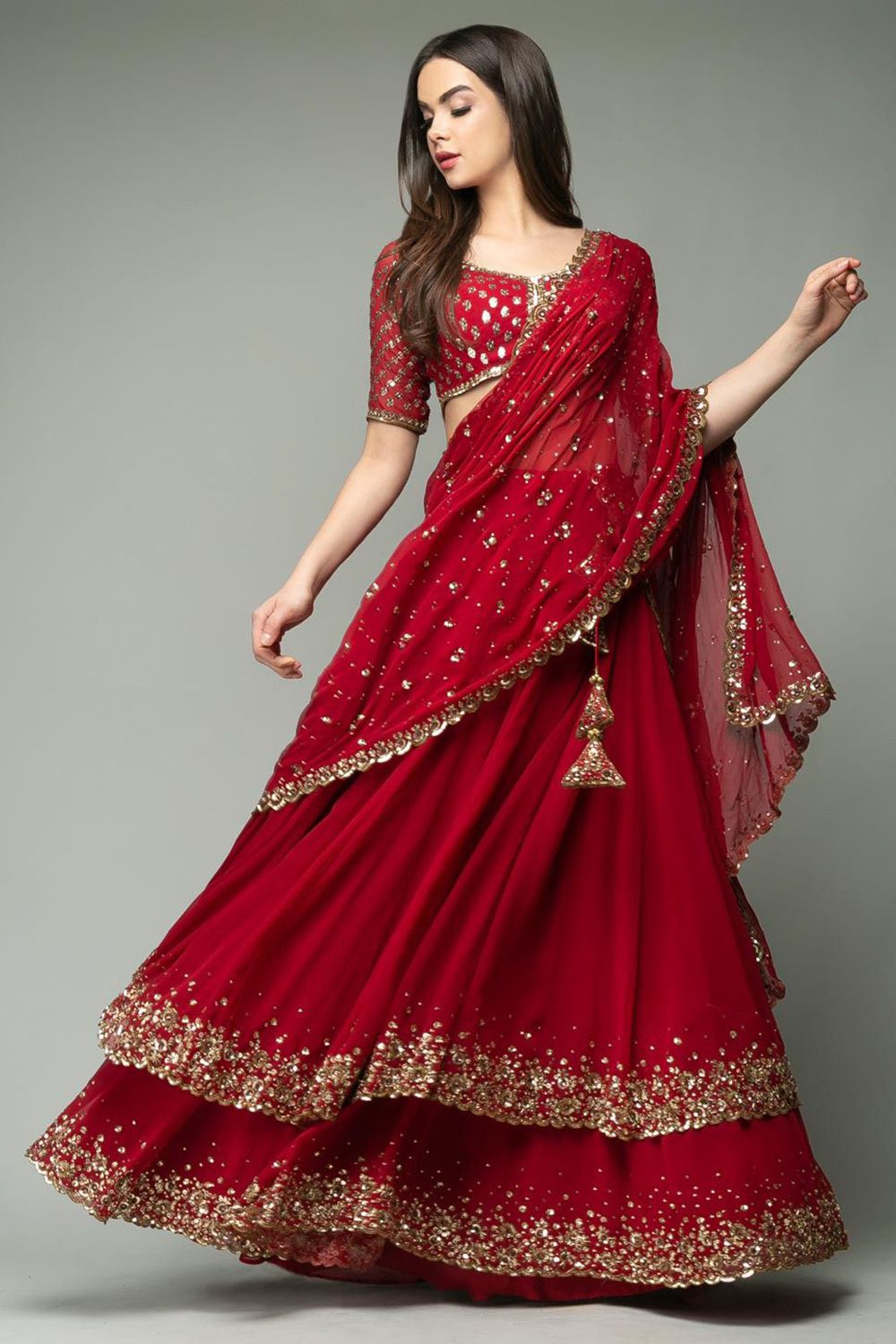 - Cherry Red Lehenga crafted from luxurious Georgette fabric with heavy sequin work.