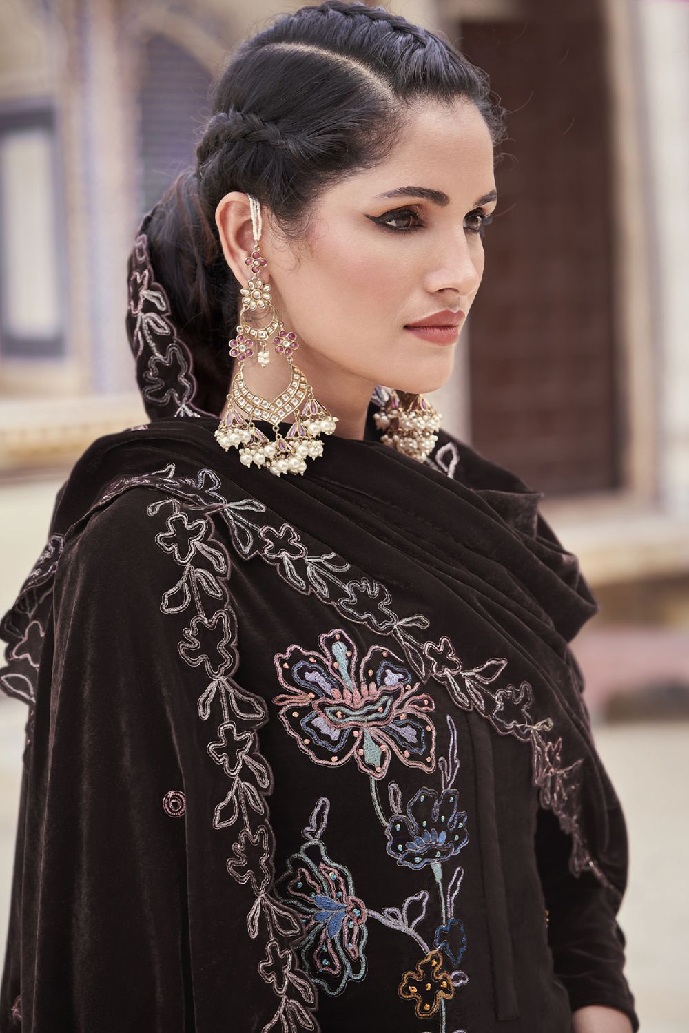 Dark Brown Velvet Salwar Kameez crafted from luxurious Velvet fabric offering heavy designer Embroidery with intricate fancy Handwork for a regal appeal.