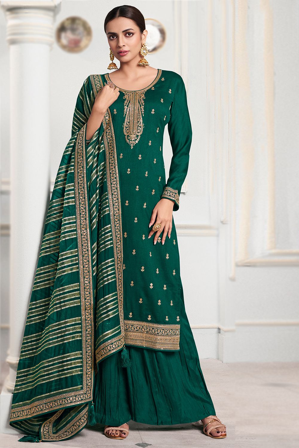 Dark Green Georgette Silk Embroidered Palazzo Suit