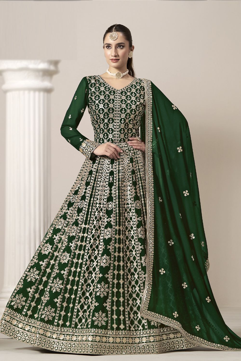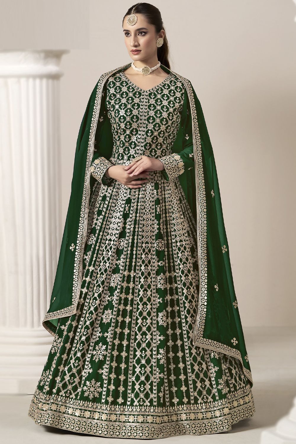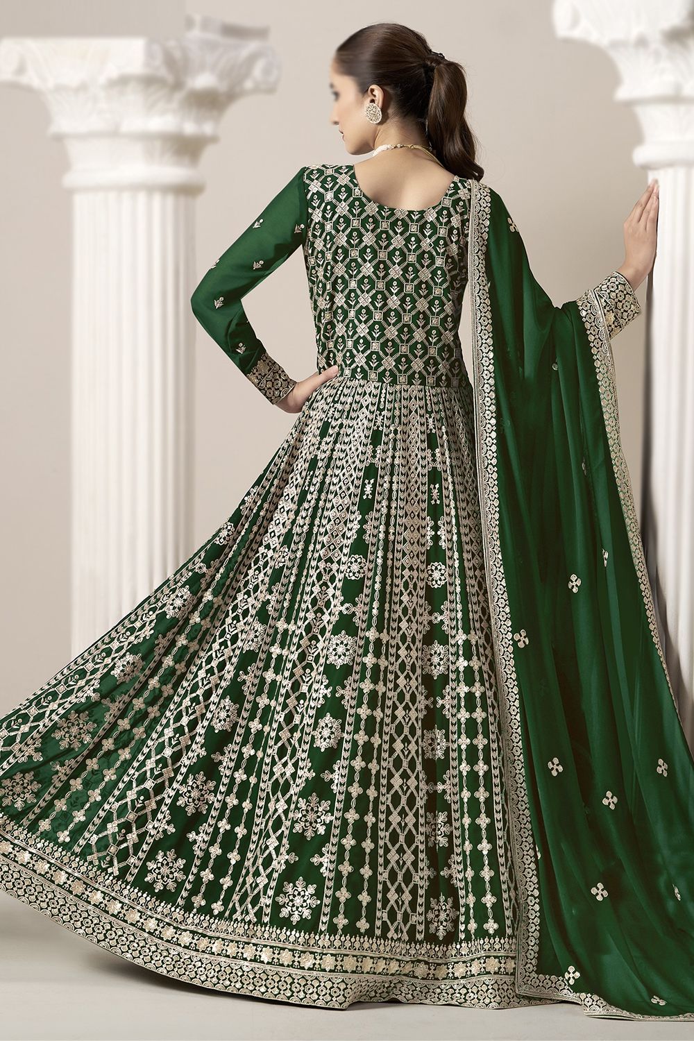 - Green A Line Anarkali Suit set in Faux Georgette base with Zari Embroidery.