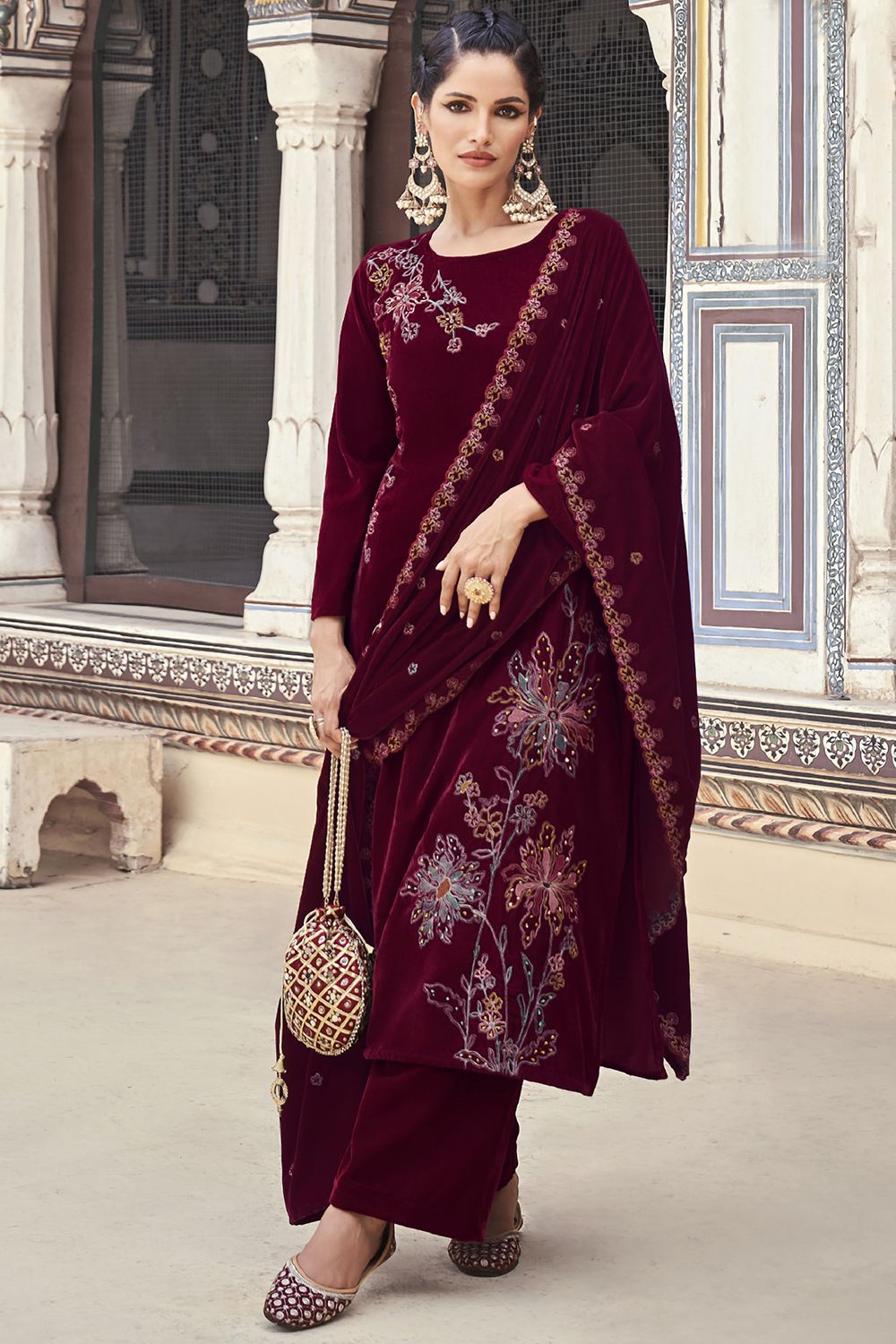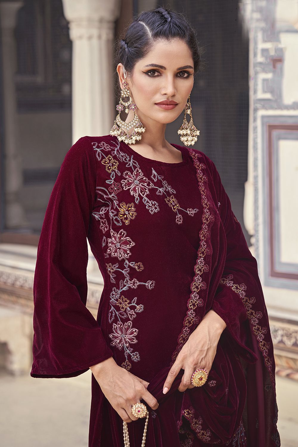 - Maroon Velvet Salwar Kameez crafted from luxurious Velvet fabric offering heavy designer Embroidery with intricate fancy Handwork for a regal appeal.