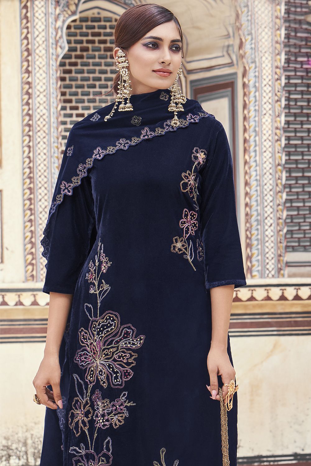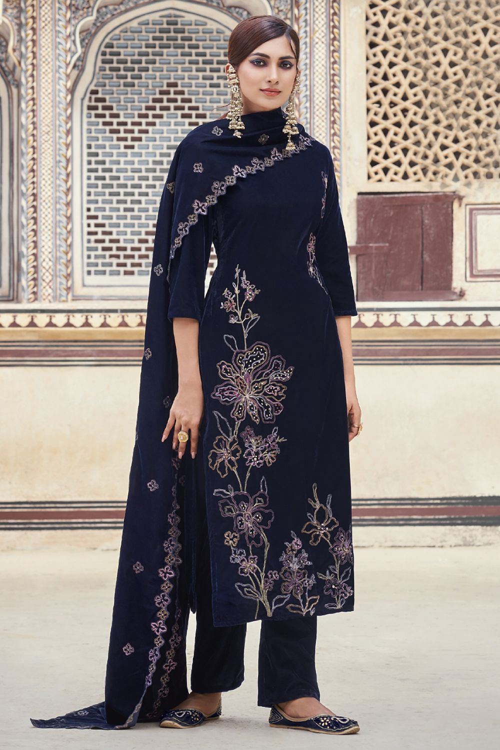 Navy Blue Velvet Salwar Kameez crafted from luxurious Velvet fabric offering heavy designer Embroidery with intricate fancy Handwork for a regal appeal.