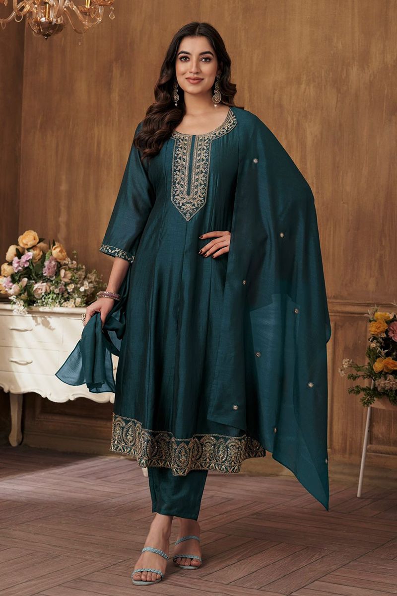 Peacock Blue Silk Embroidered Anarkali Suit Set