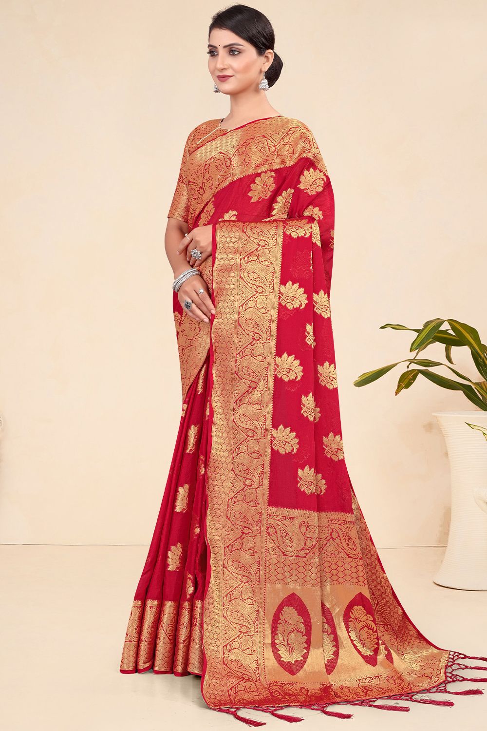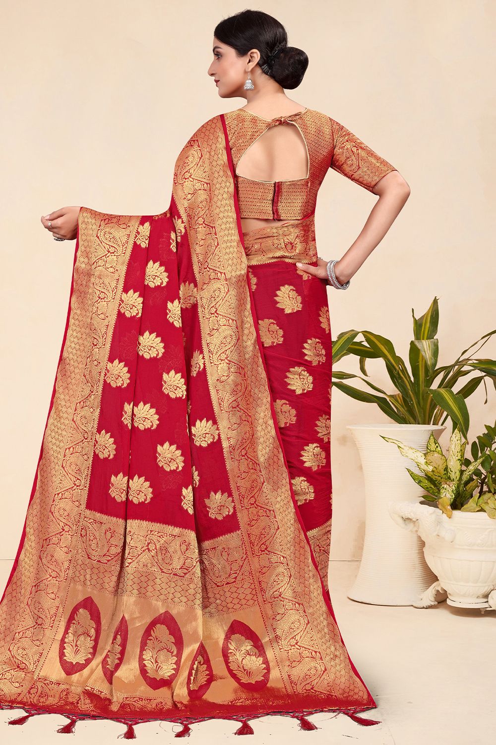 - Red Saree in Pure Viscose crafted from premium viscose fabric.