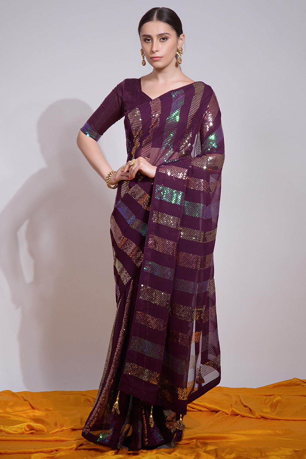 - Available with a georgette fancy saree in wine color decorated using sequins work.