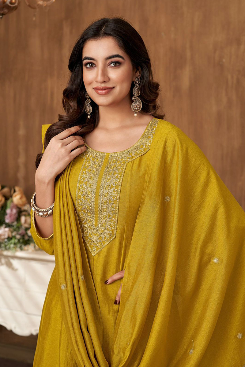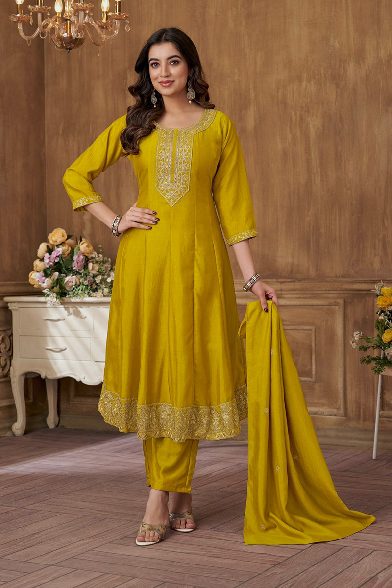 - Yellow Silk A Line Anarkali Suit set with Golden Zari Embroidery.